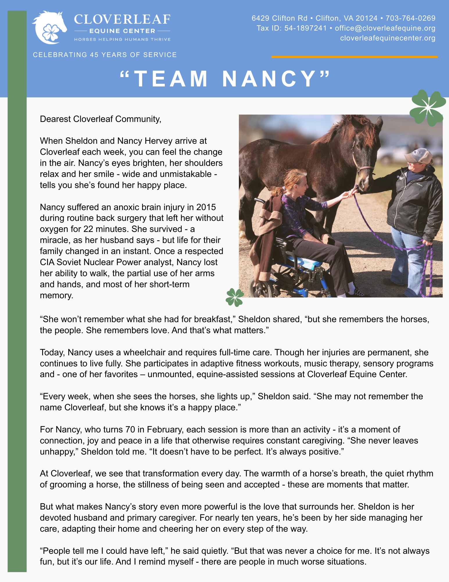 We are excited to kick off our year-end appeal by sharing the story of Nancy and Sheldon at Cloverleaf Equine Center.